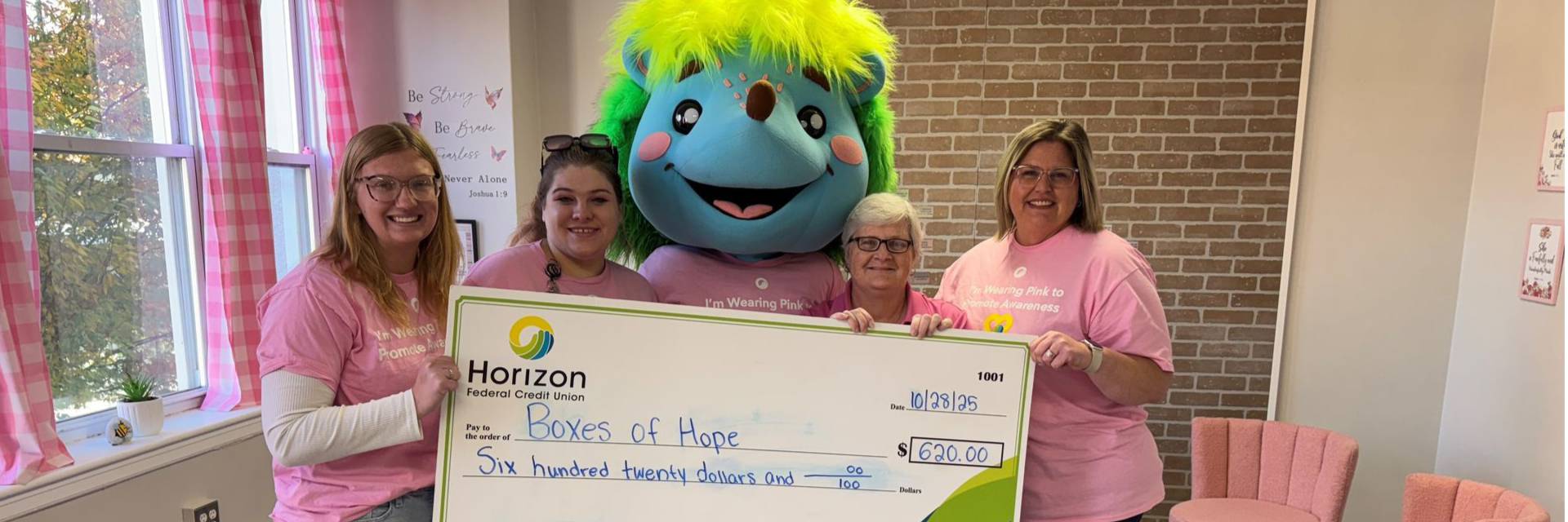Horizon created shirts, which our staff could purchase and wear on national Wear it Pink Day. A total of $620 was raised from this initiative, and donated to Boxes of Hope.